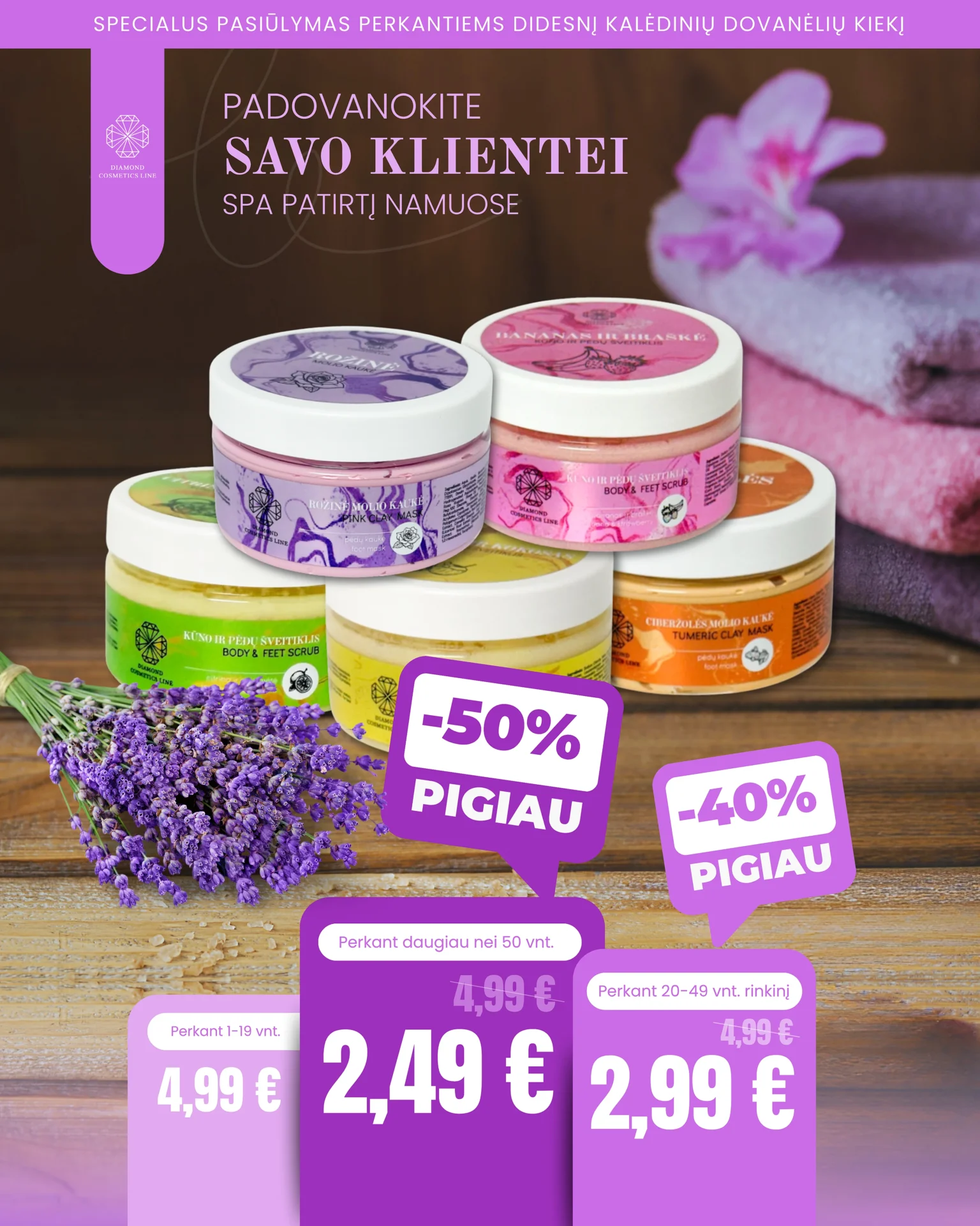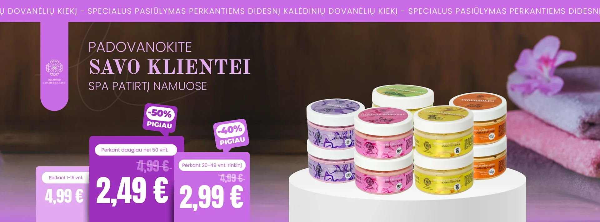 Siūlome platų aukštos kokybės manikiūro, pedikiūro ir SPA produktų asortimentą, lankstų nuolaidų modelį, kur daugiau perkant gaunama didesnė nuolaida, bei greitą prekių pristatymą.