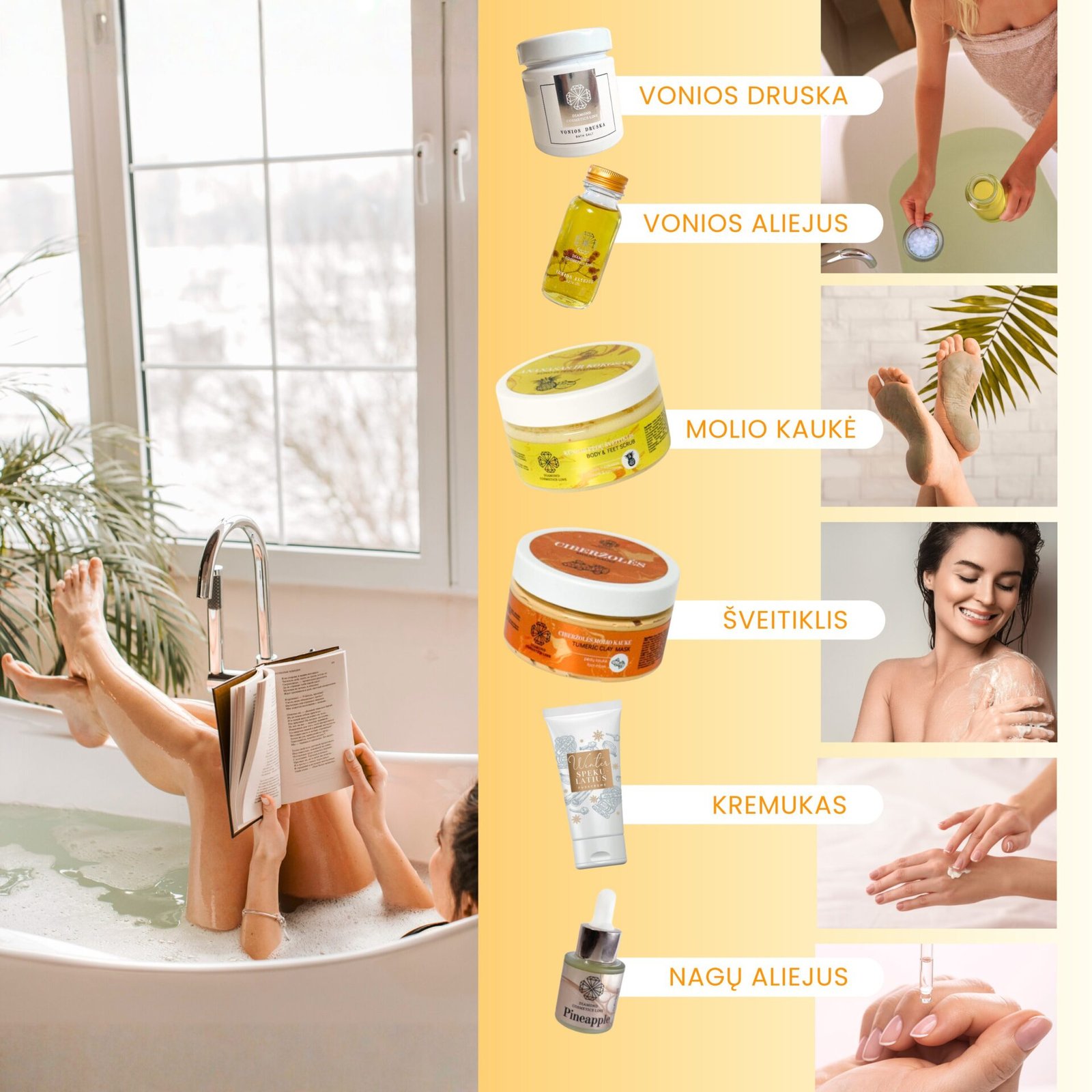 • Subtilaus migdolų kvapo magnio vonios druska (Magnesium Sulfate), dar kitaip vadinama Epsom druska. Skirta giliam raumenų atpalaidavimui ir magnio įsisavinimui per odą