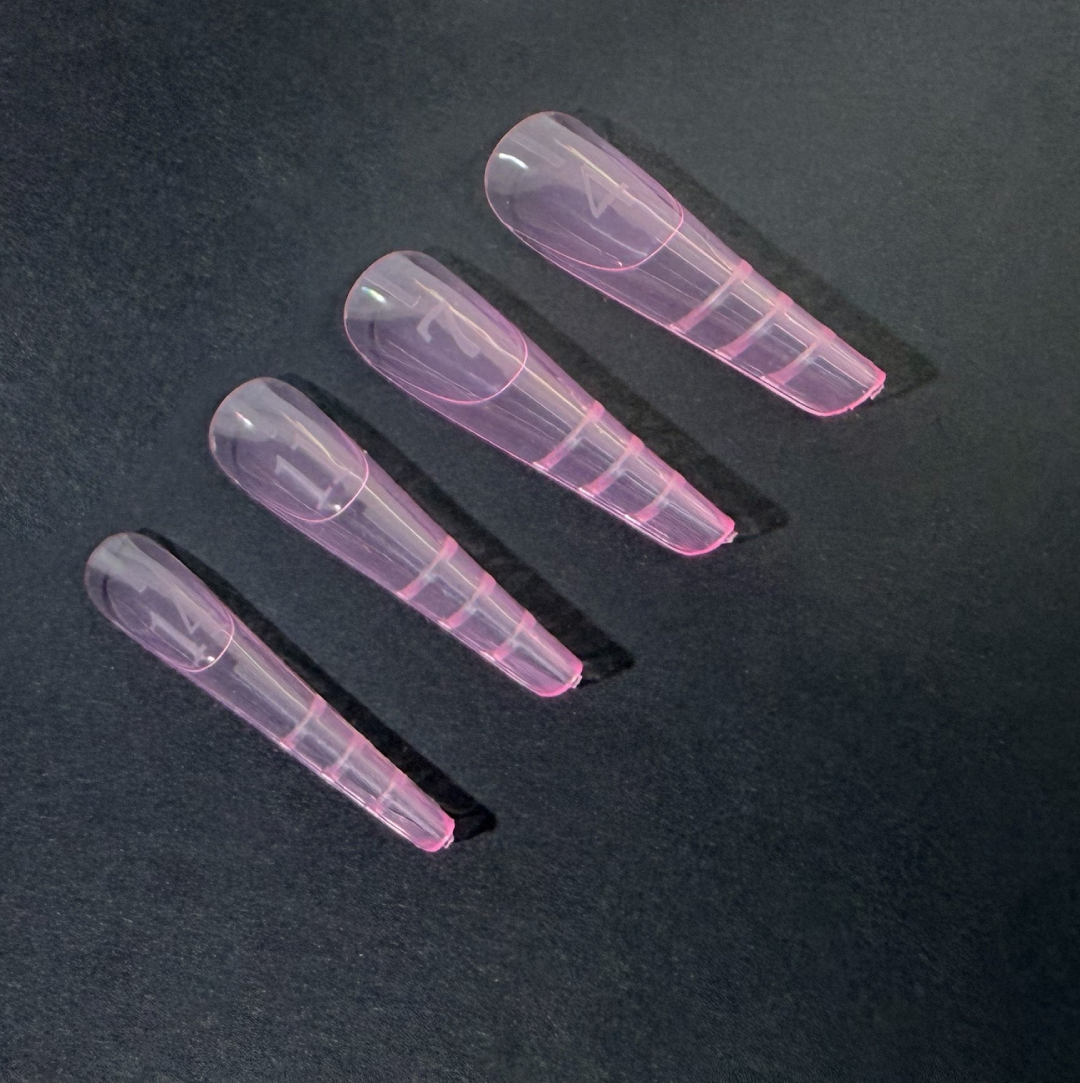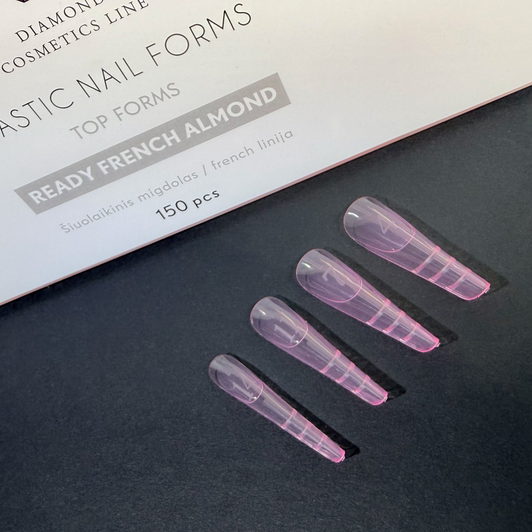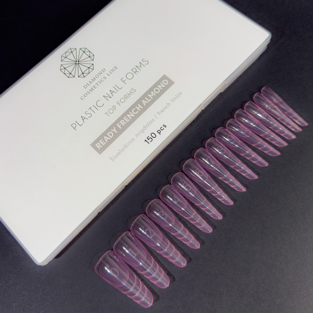 Plastikinės formelės nagų priauginimui ,,Ready French Almond”, skirtos greitam ir tiksliam nagų priauginimui geliu ar poligeliu. Šios formelės sukurtos formuoti šiuolaikinio migdolo formos nagus su aiškiai pažymėta French linija – puikus pasirinkimas tiek klasikiniam, tiek moderniam prancūziškam dizainui.